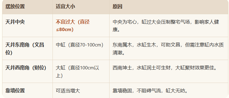 水缸大小应与天井面积成比例,遵循“大宅大缸、小宅小缸”的原则。一般建议:
