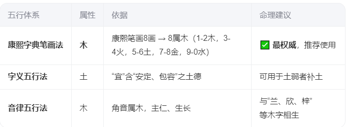 关于“宜”字五行,命理界有三说,但主流与权威取名体系均以“木”为正: