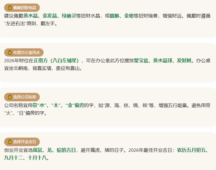 - 最佳启动月份:农历五月(午月)、九月(戌月),这两个月财星最旺,适合开业或重大决策。