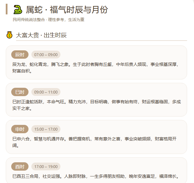 以上关于属蛇出生时辰和月份的解读,主要基于民间流传的传统文化与习俗,整理出来仅供大家娱乐参考,给生活添一份趣味。