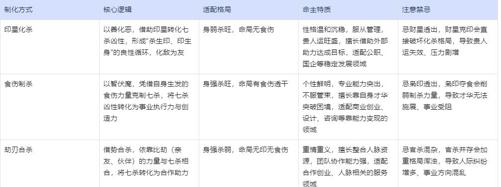 纯阴七杀格的运势走向,核心取决于制化方式与自身格局的适配性。三类主流制化方式的原理、适配场景存在显著差异,对应命主的性格特质与人生路径也各不相同,具体对比分析如下:
