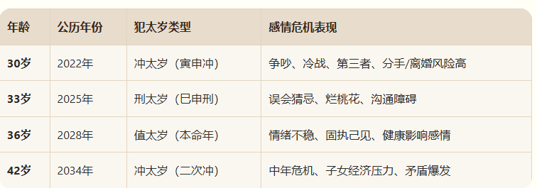 30岁是92年属猴女性遇到的第一个重大感情坎。虎与猴正冲,冲太岁之年夫妻宫动荡,容易出现争吵、冷战、第三者介入甚至分手离婚。这个年龄也是婚姻的“七年之痒”前后,加上冲太岁的冲击,感情极易生变。此年应避免重大感情决定,多沟通、少冲动。