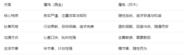 属鸡人讲求效率、规则和细节,属兔人注重情感、舒适和人际关系。价值观的差异导致双方在日常生活中容易产生矛盾。属兔人容易被属鸡人的尖锐言辞所伤,感到压抑;属鸡人则无法理解属兔人的逃避与妥协,认为其缺乏原则。