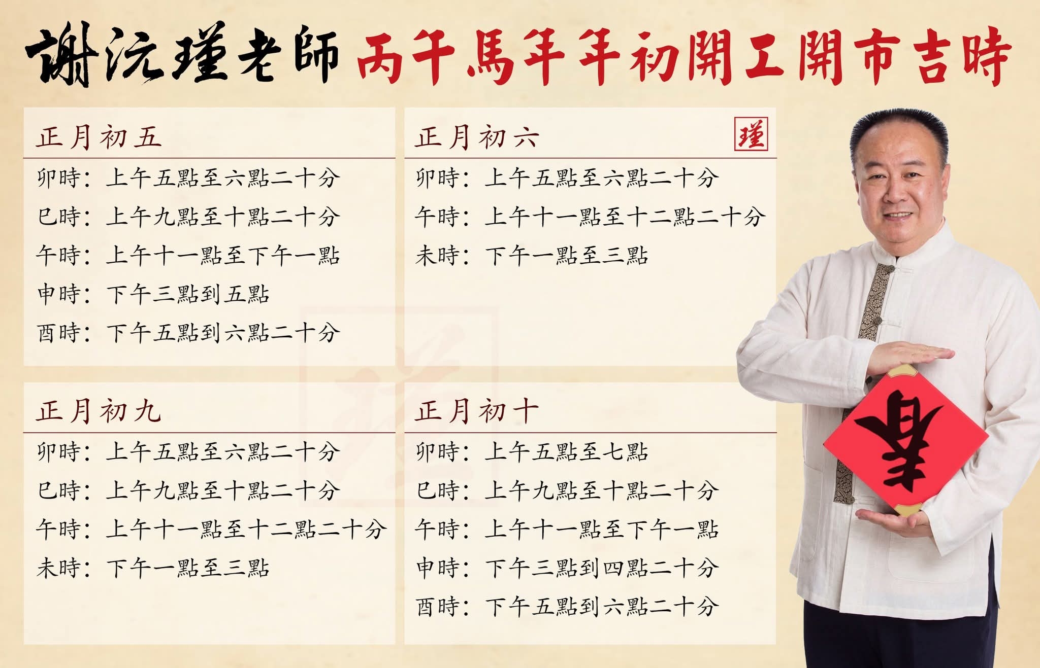 声明: 本文由真人易经网ai八字算命,在线起名,风水命理网发布于:2026-02-13 ,文章风水知识2026 丙午马年开工开市吉时|谢沅瑾老师民俗择吉主要讲述2026丙午马年,开工吉时,谢沅瑾,初五迎财神,开工祈文章。转载请保留链接: https://www.aiqmsm.com/fengshui/2399.html