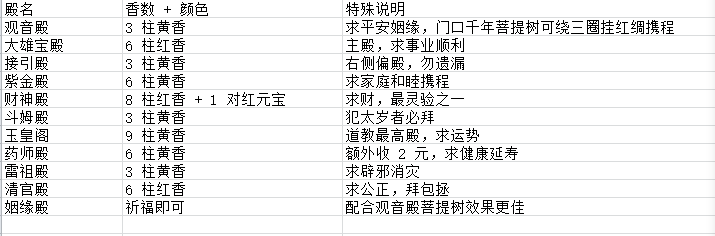 接引殿(3 柱黄香)→紫金殿(6 柱黄香)→财神殿(8 柱红香 + 红元宝)携程