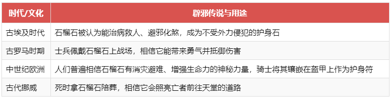 注意: 不同颜色的石榴石辟邪效果有所差异,红色系石榴石(红榴石、铁铝榴石)辟邪作用最为显著,绿色系石榴石(翠榴石)则更偏重拓展个人能力和坚定意志力。