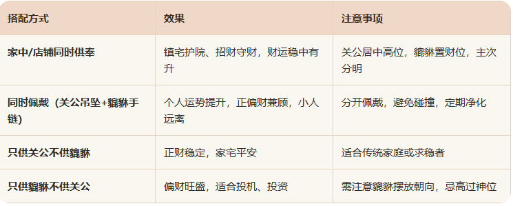 核心结论:关公和貔貅不犯冲,两者可以一起摆放或佩戴,且功能互补,相得益彰。