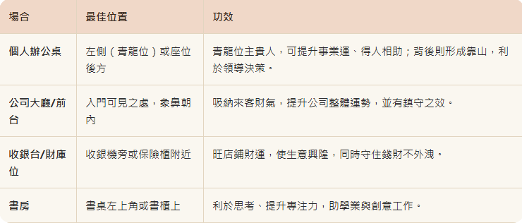 大象體型穩重,若擺放在沙發、書桌或辦公座位旁,能形成「靠山」之勢,增強貴人運,使家人或自己做事穩妥、減少波折。尤其適合家中無實牆靠背的座位。