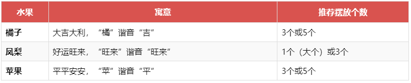 | 水果 | 寓意 | 摆放建议 |