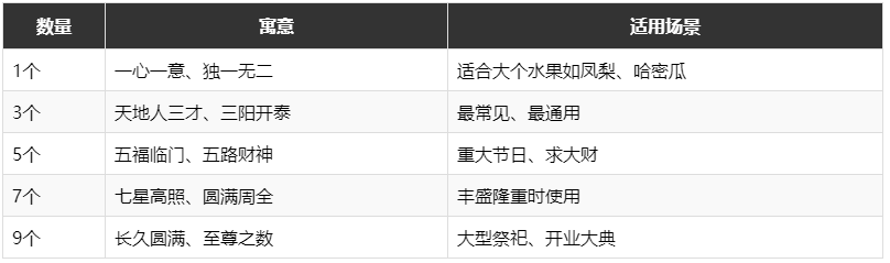 水果摆放数量的核心原则是:取单数(阳数),忌双数(阴数)。单数象征吉利、圆满、生生不息。