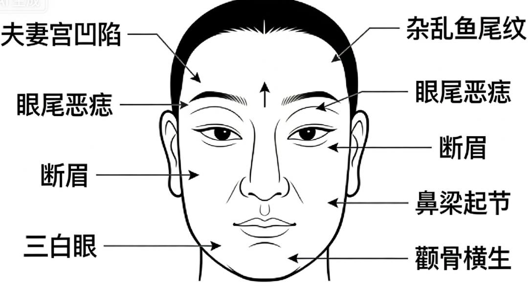 - 恶痣 / 疤痕:眼尾有黑色凸起恶痣、明显疤痕,传统认为是 “婚姻煞”,易遇感情小人、配偶健康受损,关系易生变故。