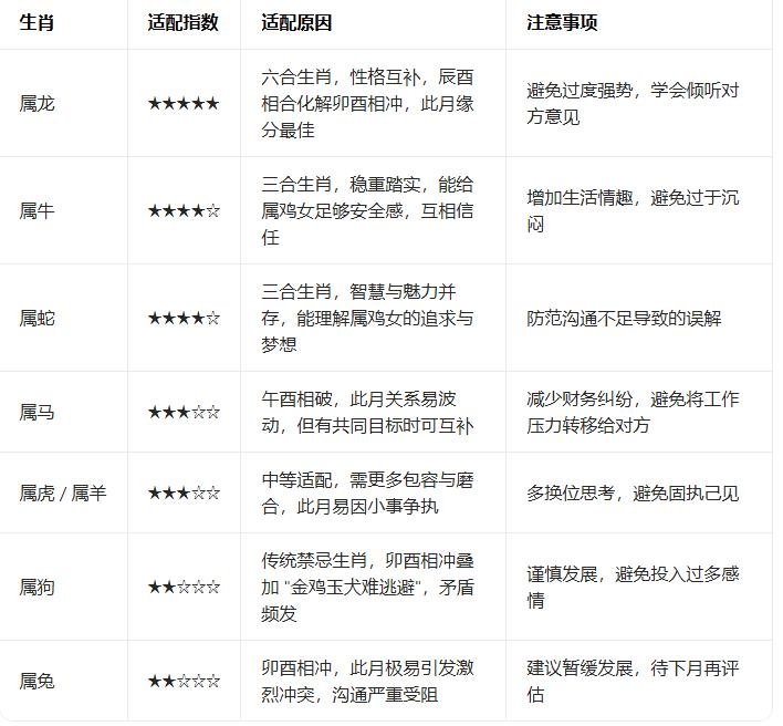 - 避免与属狗、属兔异性过快发展,传统命理中这两类生肖与属鸡存在婚配禁忌。