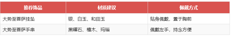 最佳佩戴组合: 大势至菩萨本命佛挂坠 + 红绳手链 + 朱砂手串(三选二即可,不宜过多)