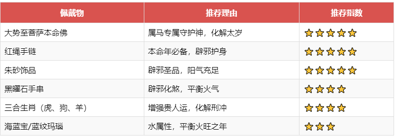 直接答案:大势至菩萨本命佛、红绳、朱砂、黑曜石、三合生肖饰品是属马人本命年最推荐的佩戴物。