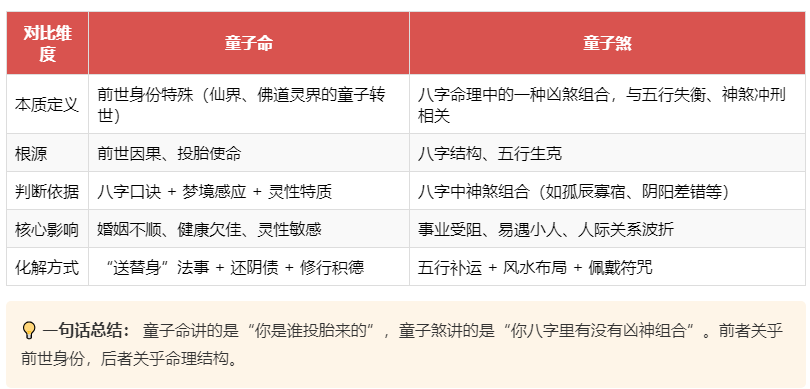 一句话总结: 童子命讲的是“你是谁投胎来的”,童子煞讲的是“你八字里有没有凶神组合”。前者关乎前世身份,后者关乎命理结构。