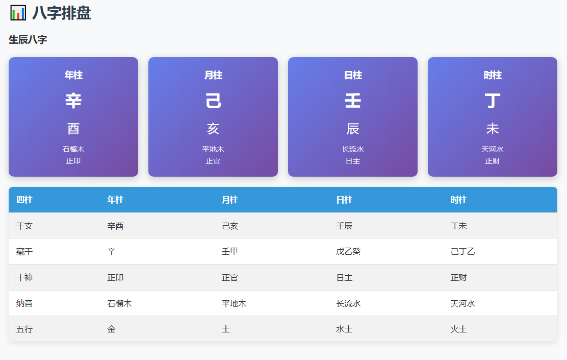 年柱辛酉正印:祖上显赫,有文化底蕴,但早年家运亦有起伏。月柱己亥正官:有管理才能,有社会地位,月干正官透出,主贵气。时柱丁未正财:丁壬相合,财来合我,主富;未为财库,财星有库,可积聚巨大财富。官印相生:年柱正印生扶月干正官,构成官印相生的贵格,主其能得官方支持,将权力与名声有效结合。