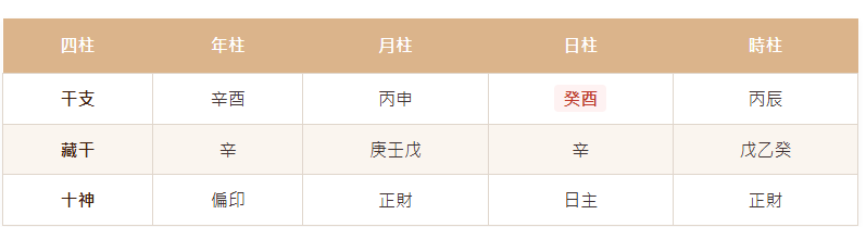 日主癸水,坐在酉金偏印之上,年柱亦是辛酉,月支申金,金氣氾濫成勢。時柱丙辰,辰為水庫,內藏癸水為根。整體而論,金多水濁,日主轉強為旺,卻過猶不及,命局偏寒偏燥之氣交雜。