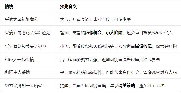 核心结论:整体以吉兆为主,象征财富收获、机遇降临、家庭和睦;但需结合采摘数量、蘑菇状态、人群差异判断,少数情况含警示意义。