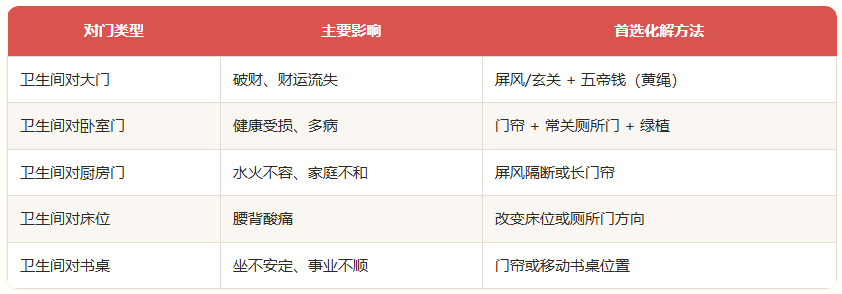 核心原则: 卫生间门宜常关、宜隐蔽、宜洁净。化解门冲煞,首选屏风/玄关隔断,其次悬挂门帘+五帝钱,搭配绿植净化,效果最佳。