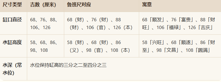 核心观点:水缸大小应以鲁班尺(文公尺)上的「财、义、官、本」四吉字为准,缸口直径以68、76、88、106厘米等吉数为佳。水缸宜选圆形,置于天井吉位,水位保持七分满,方为聚财之象。