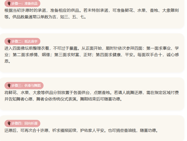 核心原则:还愿需以诚心为本,还愿方式应与当初许愿时承诺的一致。若未特别承诺,可选择鲜花、水果、香烛、大象雕刻或请人跳舞还愿。还愿宜早不宜迟,心愿达成后应尽快履行。