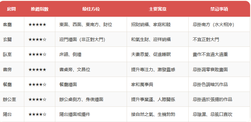 荷花圖五行屬水,懸掛時除了考慮房間功能,還需結合風水方位,以達到趨吉避凶的效果。以下為台灣、香港風水師普遍推薦的幾個最佳位置。