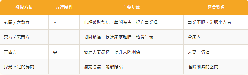 - 避開禁忌:勿掛在廁所、廚房、橫梁下或陰暗角落。