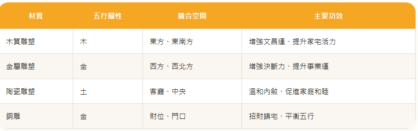 三、雕塑材質的五行對照與擺放建議