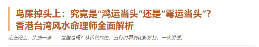 小编总结: 鸟屎掉头上是吉是凶?从香港、台湾的风水命理来看,并没有统一的标准。它既可以解读为“霉运当头”,也可以理解成“鸿运当头”,关键在如何看待和应对。若相信传统民俗,不妨依照上述方法做点化解,求个心安;若不信,及时清理、平常心对待即可。真正的“运气”始终掌握在自己手中——保持积极乐观的心态,脚踏实地的努力,才是最好的风水。