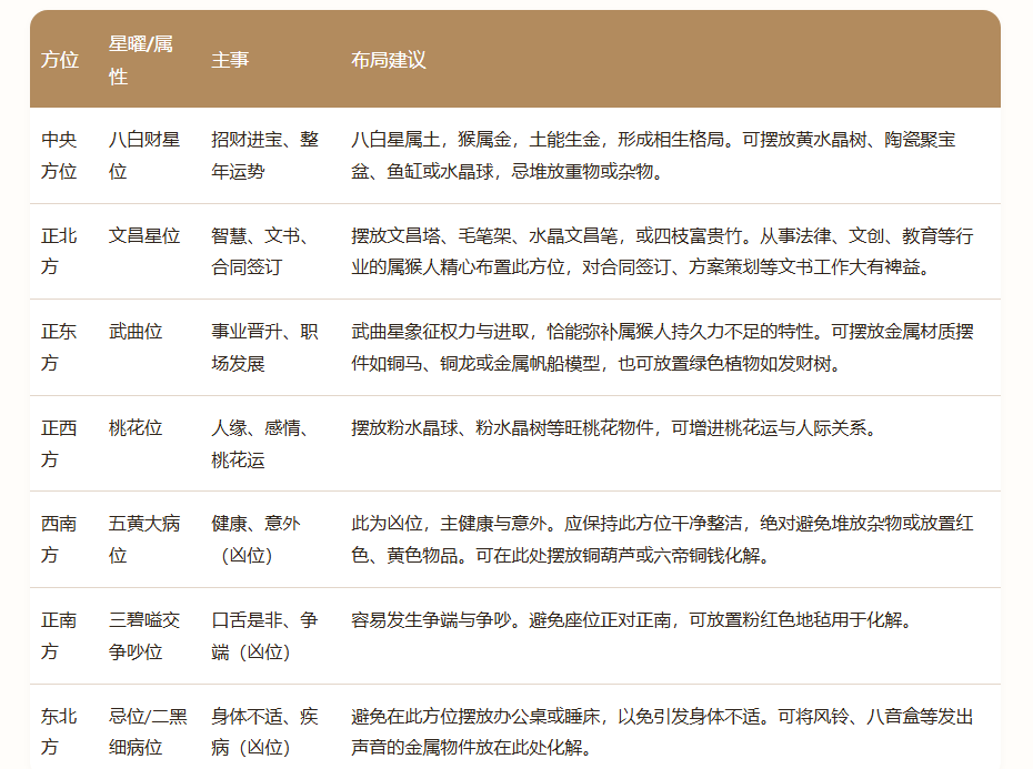 除了专属财位和办公桌朝向,办公室内各方位的气场吉凶也需要重点关注。以下为属猴人办公室各方位的风水解析: