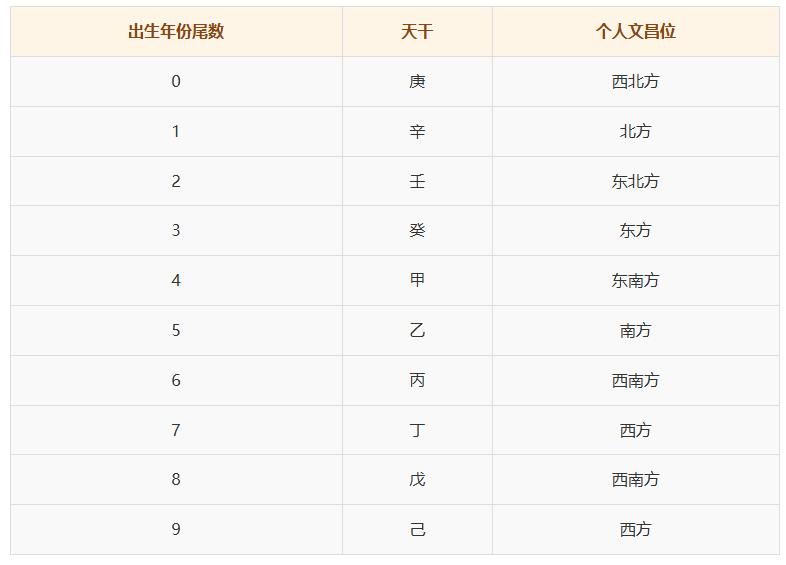 个人文昌位是根据出生年份的天干地支推算出来的,查找方式如下: