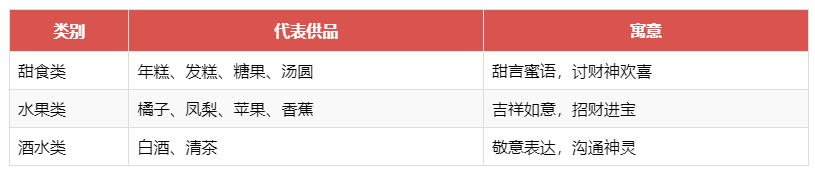 - 推荐供品:发糕、年糕、汤圆、糖果、清茶、水果(苹果、橘子)