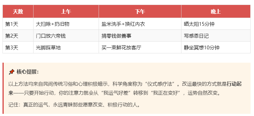 以上方法均来自民间传统习俗和心理积极暗示,科学角度称为“仪式感疗法”。改运最快的方式就是行动起来——只要开始行动,你的注意力就会从“我运气好差”转移到“我正在变好”,运势自然改变。