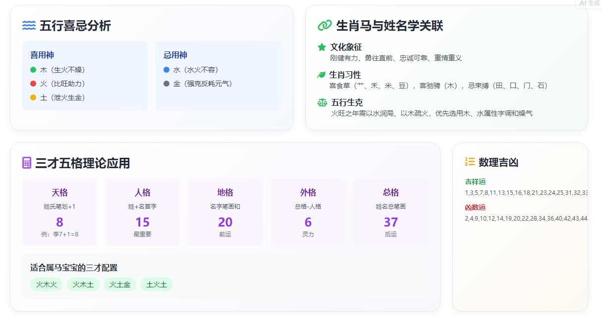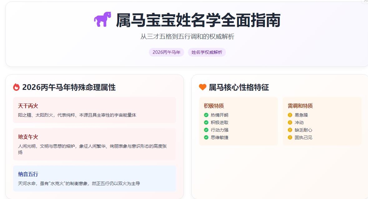 声明: 本文由真人易经网ai八字算命,在线起名,风水命理网发布于:2026-02-10 ,文章取名面相属马宝宝姓名学全面指南 从三才五格到五行调和主要讲述属马宝宝姓名,三才五格,2026 丙午马年文章。转载请保留链接: https://www.aiqmsm.com/quming/2394.html