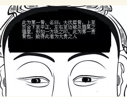 - 巨鳌伏犀骨是椭圆形,像鸡蛋,范围次之,从发际到华盖,主文武双全。