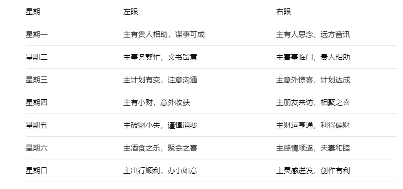 为方便读者随时查阅,兹将一星期七日之眼跳寓意完整列出:
